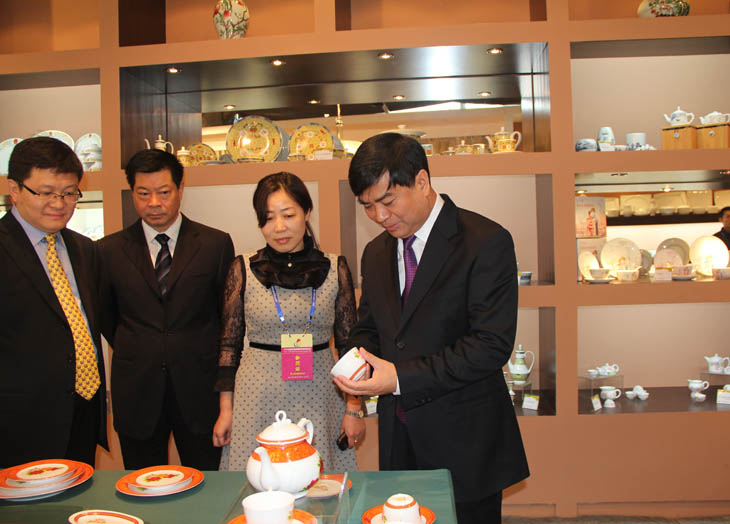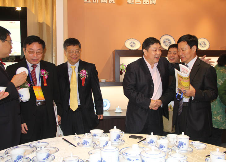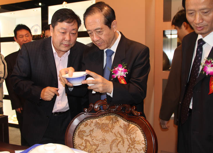 全國人大常委會(huì)副委員長韓啟德在我公司展館參觀,對(duì)我公司在全國青花玲瓏及青花日用陶瓷器形與裝飾設(shè)計(jì)大賽金獎(jiǎng)作品《憶漢》非常感興趣