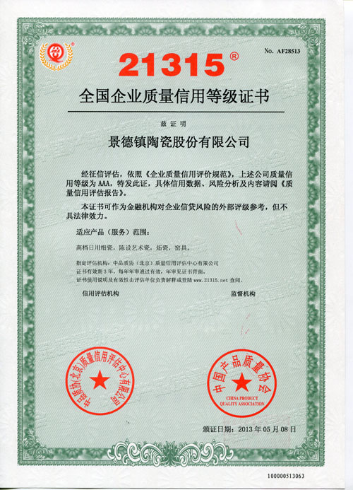 據(jù)了解,榮獲《中國21315質(zhì)量信用等級AAA級證書》的企業(yè)可在網(wǎng)站系統(tǒng)上進(jìn)行查詢。質(zhì)量信用等級從AAA到D共有10個(gè)級別,AAA級是質(zhì)量信用等級的最高級別,意思是產(chǎn)品質(zhì)量信用“非常好”。