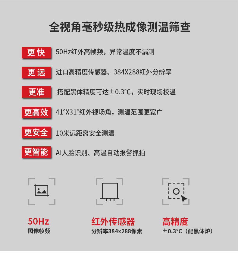 ·標(biāo)配黑體,實時溫度校正,測溫精度士0.3°℃·智能快速識別測溫,效率可達(dá)900人/分鐘·AI人臉識別,排除異常熱源干擾,誤報率更低20年非接觸紅外測溫研發(fā)經(jīng)驗,測溫更優(yōu)更準(zhǔn)確
