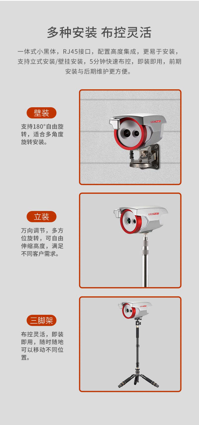 2安裝與維護(hù) 2-1,紅外熱像告警系統(tǒng)部署原則 Al-2021紅外熱像告警系統(tǒng)屬于精密測(cè)溫和成像設(shè)備,對(duì)部署應(yīng)用有一定要求,注意事項(xiàng)如下: ·安裝環(huán)境:設(shè)備機(jī)頭所處位置需光線良好(照明度≥10OLux),應(yīng)避免處于逆光的位置;設(shè)備機(jī)頭布置位置附近3米范圍內(nèi)不應(yīng)有空調(diào)出風(fēng)口;設(shè)備機(jī)頭所監(jiān)控的視場(chǎng)內(nèi),不能受到光照、西曬等外界強(qiáng)熱源的干擾; ·機(jī)頭布置:合理布置A-2021機(jī)頭的位置,向下俯視角度為13°~15°;合理布局人員檢測(cè)位置和范圍,AI-2021機(jī)頭的攝像頭距離被測(cè)人員的額頭的位置為1.0~5.0米,最佳測(cè)試位置為2.0米;