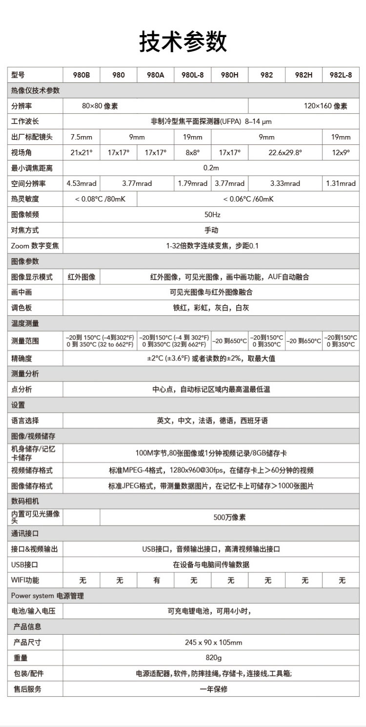 標(biāo)配鏡頭19mm,分辨率160×120,IFOV:1.31mard,視場角12×9°,熱靈敏度NETD<0.06℃,圖像幀頻50Hz,溫度范圍(-20-150、0-350),可見光分辨率500萬像素